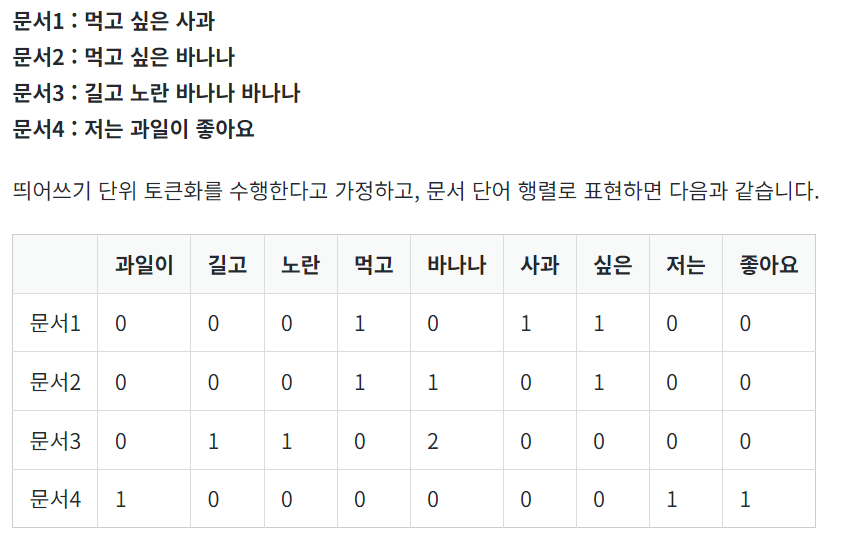 -1단계: 단어에 인덱스 부여, 2단계: 각 인덱스 위치에 등장 횟수 기록