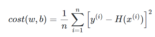 -Linear Regression에 적합한 비용함수: 평균제곱오차(MSE), 모든 오차를 제곱해 더하여 평균을 구함