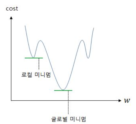 -경사하강법: 비용함수를 미분해 접선의 기울기를 구하고, 그 기울기가 0으로 향햐도록 w 값을 반복해서 변경