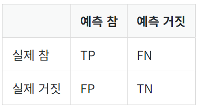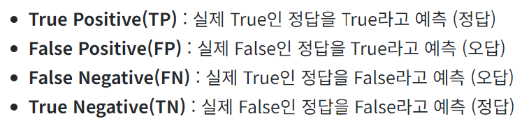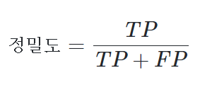 1) 정밀도(Precision): 다 True라고 하긴 했는데 얼마나 정밀한 True인지, 모델이 예상한 True 값 중 실제 True 값