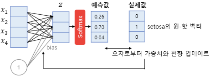 -오차계산방법: "예측결과"와 "실제값을 원핫벡터로 표현한것"을 비교, 비용함수는 Cross Entropy 함수 사용
