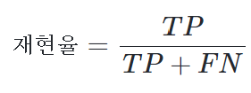 2) 재현율(Recall): 실제 True 값 중에 모델이 얼마나 True로 잘 재현했는지
