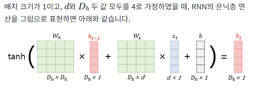 Step1) 은닉층: 현재시점의 입력값 Xt(d차원)과 가중치 Wx가 곱해지고, 이전시점으로부터의 은닉상태값 ht-1(D차원)과 가중치 Wh가 곱해지고, 편향 b가 더해져서 결과인 ht를 출력