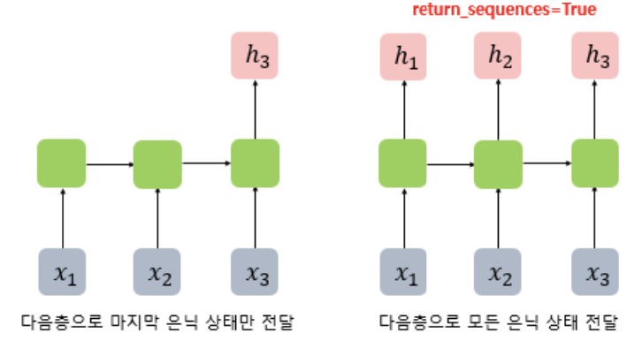 첫번째 은닉층에서 return_sequences=True를 설정해 다음 은닉층으로 모든 시점의 은닉상태값을 보내줌