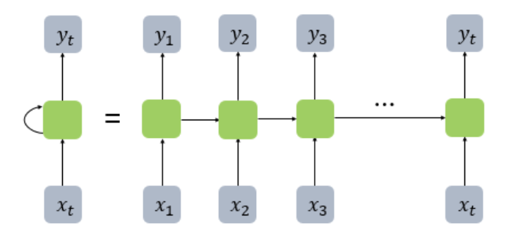 -재귀활동: 은닉층의 메모리셀은 각시점(t)에서 이전시점(t-1)으로부터 온 값을 자신의 입력으로 사용. 아래 그림들 참고