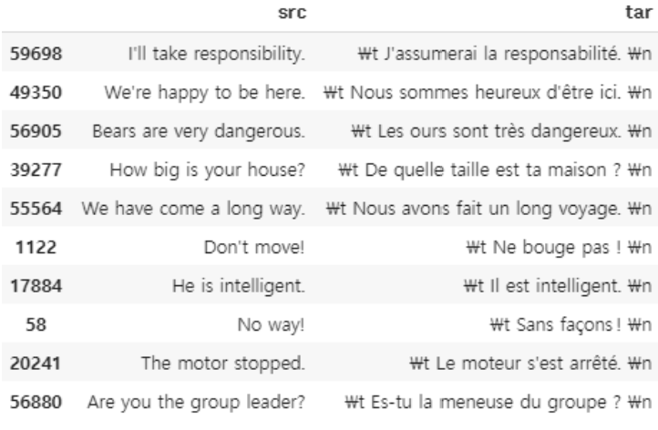 병렬 코퍼스: 두 개 이상의 언어가 병렬적으로 구성된 코퍼스프랑스-영어 병렬 코퍼스 파일 다운로드 : http://www.manythings.org/anki 에서 fra-eng.zip 파일