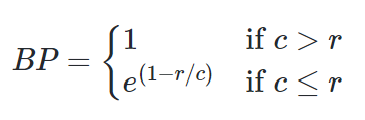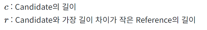그러나 BLEU는 짧은 문장에 대해 잘 작동하지 못함. 따라서 짧은 문장에 대해 페널티 점수를 줌(=BP, Brevity Penality)