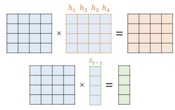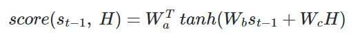 Attention(Q, K, V) = Attention Value 에서 Query가 t-1 시점의 디코더의 은닉상태라는 점이 다름. 즉, Attention score를 구할 때 st 대신 st-1 사용