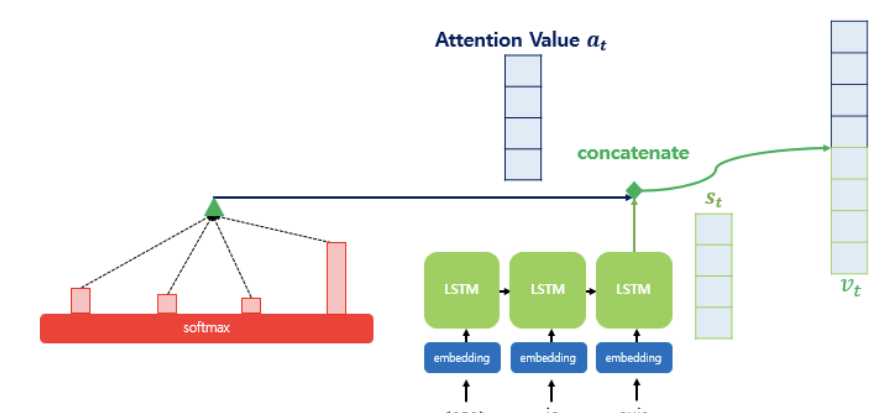 최종 어텐션 값 a와 디코더의 은닉상태 s를 결합(concatenate)하여 하나의 벡터 v로 만든다.