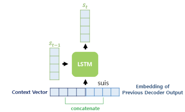 위 그림에서, 디코더(초록색)의 각 LSTM 셀은 출력단어를 예측하기 위해 인코더의 모든 입력단어 정보를 다시 참고한다.