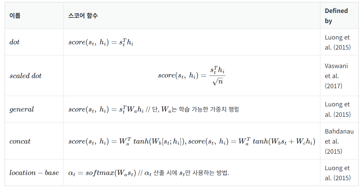 여러 종류의 Attention이 있지만, Attention Score를 구하는 방법만 다르다.